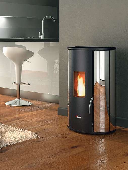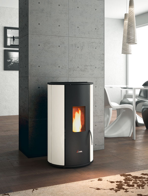Salamandra redonda, com um design inovador, saída de fumos posterior, recolha de cinzas instantânea, cartão electrónico para programação semanal e telecomando.
