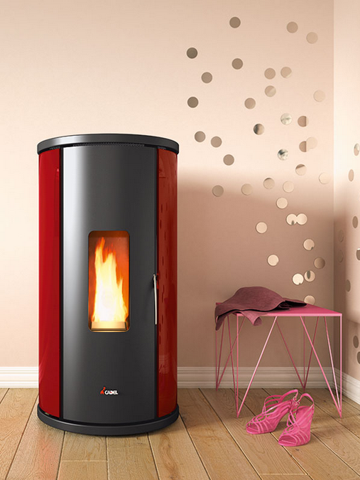 Salamandra redonda, com possiblidade das laterais em cromado, saída de fumos posterior, cartão electrónico para programação semanal e telecomando.