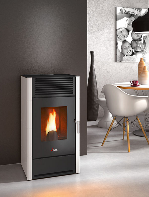 Salamandra prática e ecológica, com um design moderno, saída de fumos posterior, recolha de cinzas instantânea, cartão electrónico para programação semanal e telecomando.