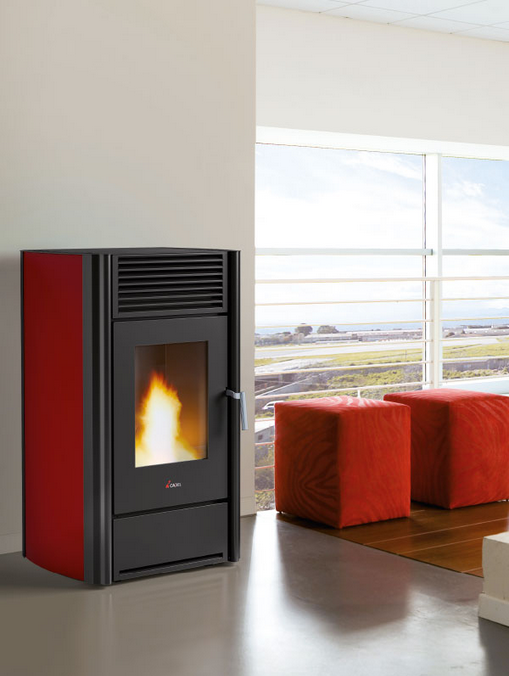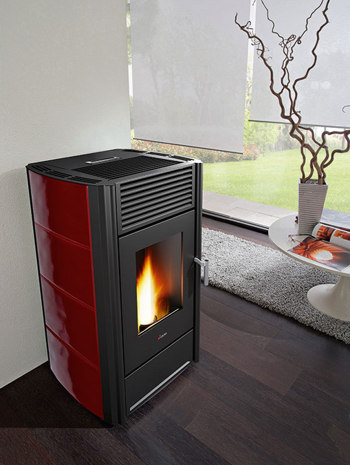 Salamandra económica, com um design moderno, saída de fumos posterior, recolha de cinzas instantânea, cartão electrónico para programação semanal e telecomando.