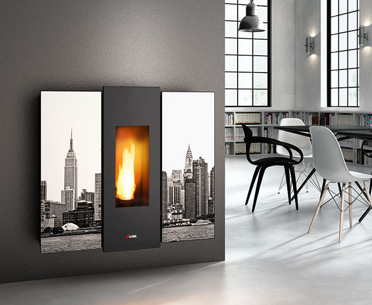 Salamandra única e pessoal, com um design atrativo, saída de fumos posterior, superior e lateral, recolha de cinzas instantânea, cartão electrónico para programação semanal e telecomando.