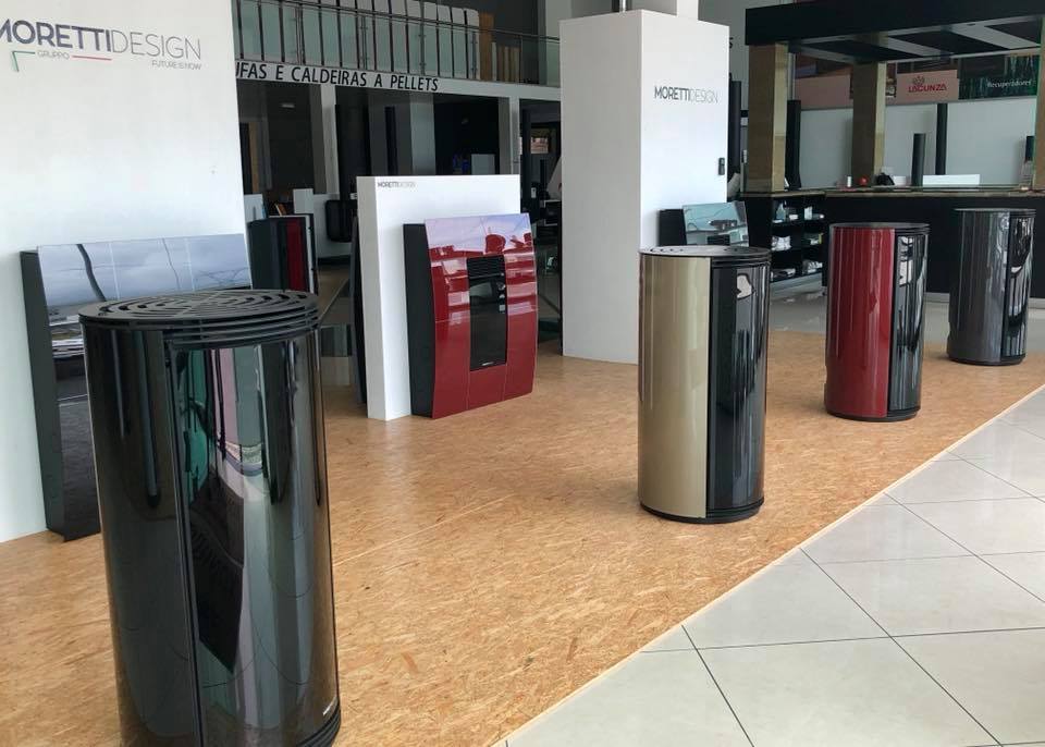 Salamandra a pellets com linhas elegantes e modernas. 2 saídas traseiras (2 motores), Ventilação Frontal (1 motor) e saída de fumos traseira (2 motores). Disponível em Branco, Preto, Vermelho, Champanhe e Cinza. Ideal para casas passivas com baixos níveis de emissão.