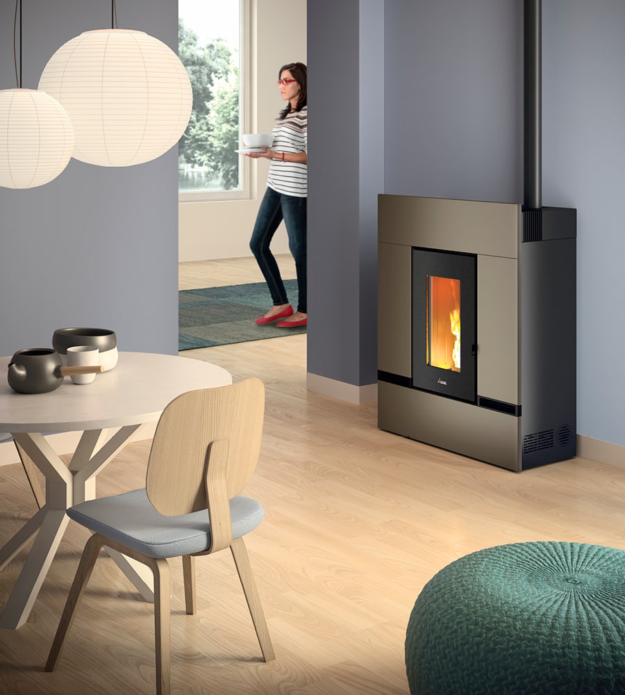 Este fogão canalizável com várias soluções de instalação apresenta um design mínimo e profundidade reduzida. As duas grelhas de ventilação inferiores garantem uma melhor distribuição do ar em toda a casa. Disponível em 5 cores: Branco, Bronze, Titânio, Vermelho e Antracite.