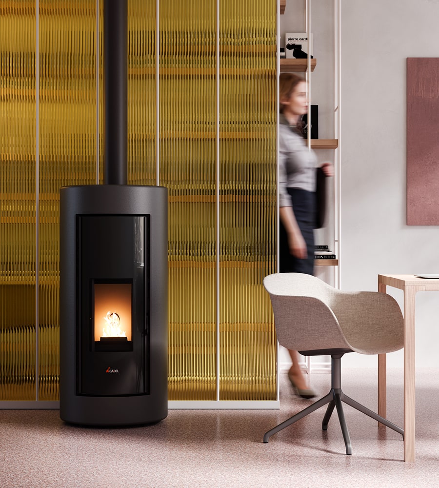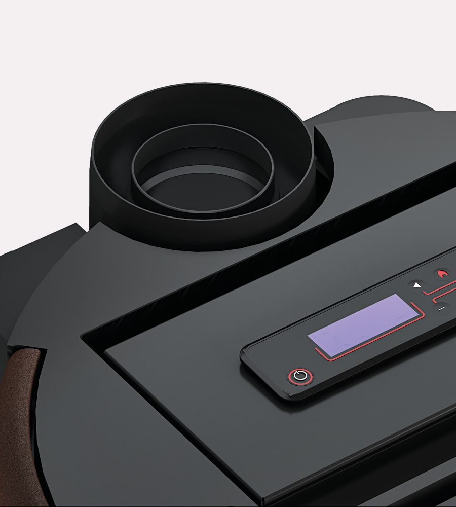 Linhas arredondadas e materiais de alta tecnologia para uma salamandra a pellets selada e de design sofisticado. Quando desligada, a frente do Magic Glass escurece, transformando-se num verdadeiro objeto decorativo. A saída de fumos superior permite instalar o aparelho rente à parede, otimizando o espaço. Disponível em branco, titânio, bronze escuro ou antracite.