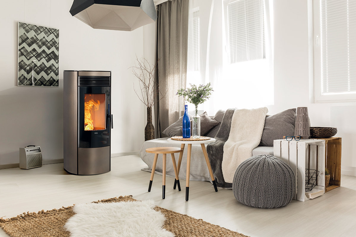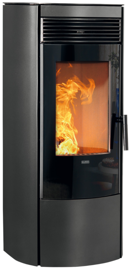 Salamandra a pellets com porta curva com vidro duplo. Painéis com formato especial. Tampo em aço de 5mm com predisposição de descarga superior. Sensores de segurança na porta e tanque. Queimador autolimpante. WiFi como padrão.